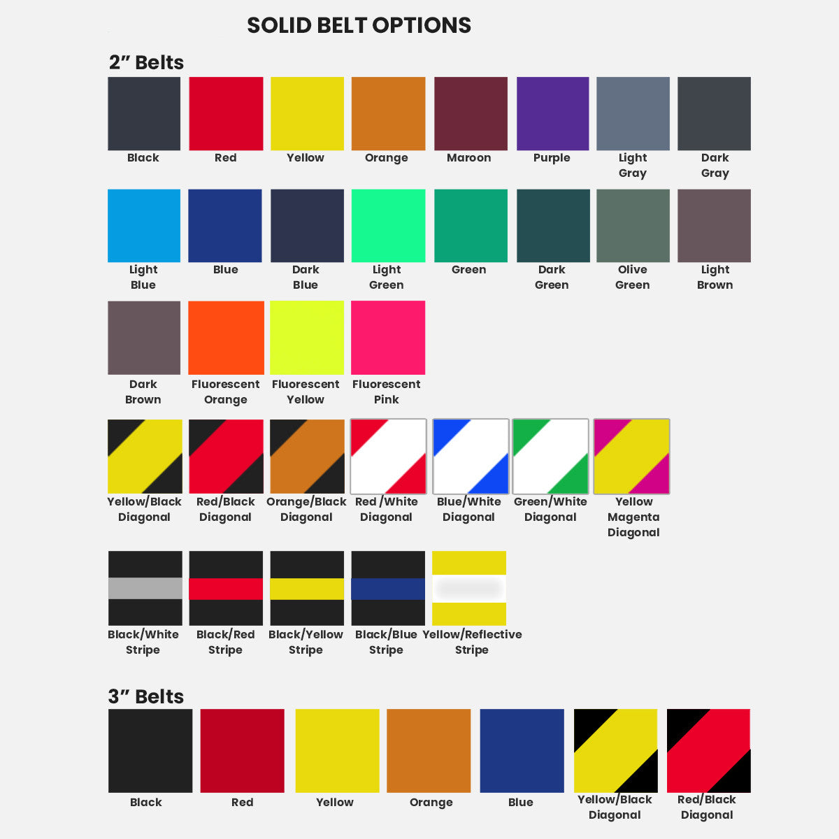 Most Common Belts: Yellow / Black Diagonal | Yellow / Black CAUTION-DO NOT ENTER | Yellow / Black AUTHORIZED ACCESS ONLY | Red / White AUTHORIZED ACCESS ONLY | Red / White NO PARKING