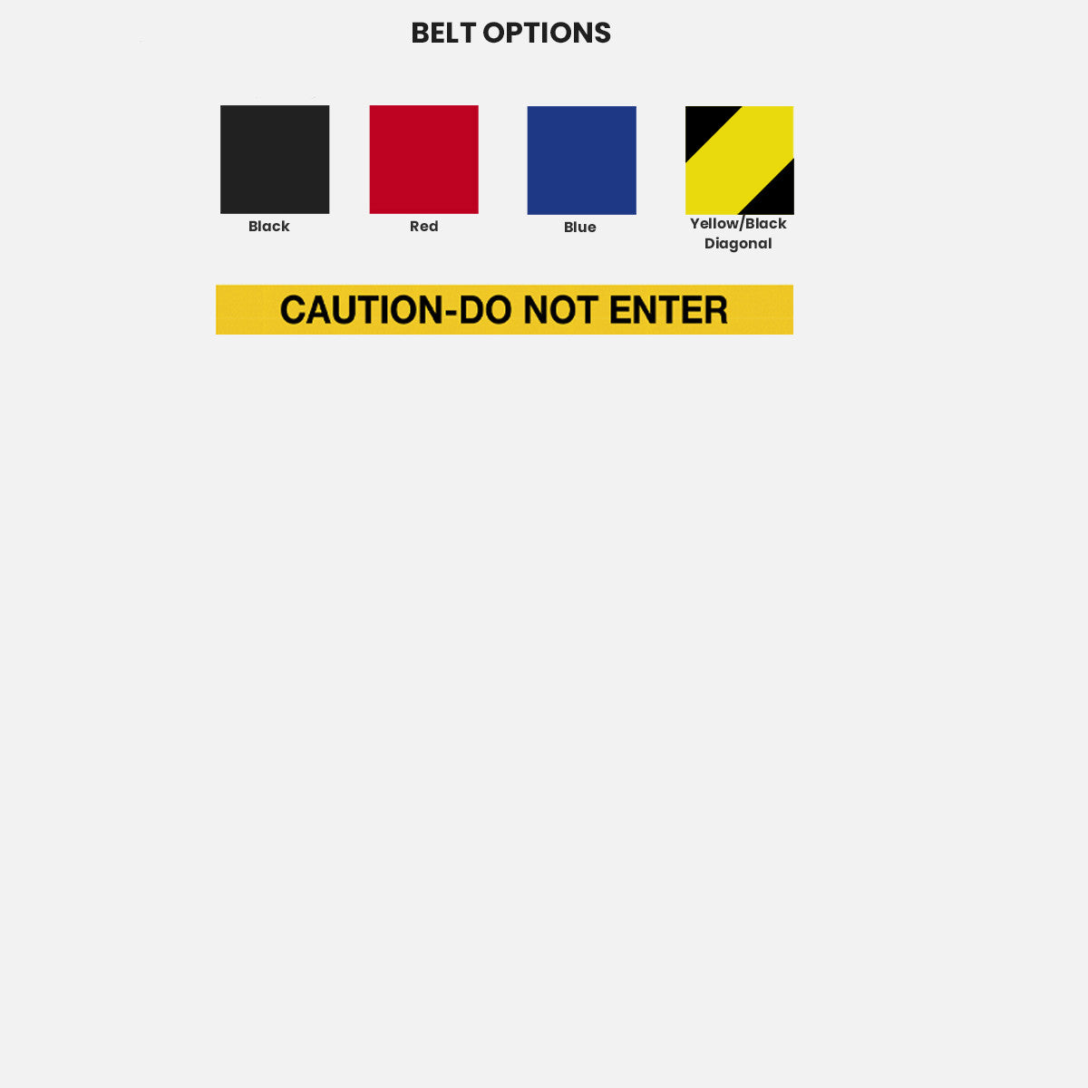 - Belt Options: Black / Red / Blue / Yellow & Black Diagonal / Yellow with CAUTION-DO NOT ENTER in Black